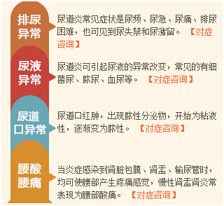 1.排尿异常:尿路感染常见的排尿异常是尿频、尿急、尿痛,也会有尿失禁和尿潴留。慢性肾盂肾炎引起的慢性肾功能衰竭的早期会多尿,后期会出现少尿或无尿。">>>>多相关知识,您可以咨询在线客服